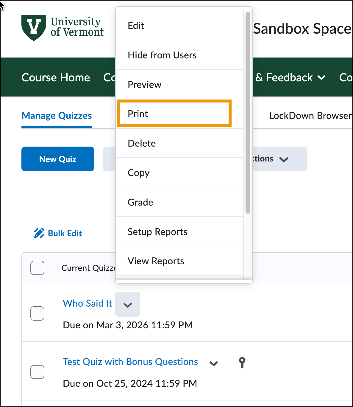 - Go to Course Tools > Quizzes and locate the quiz you want to print.