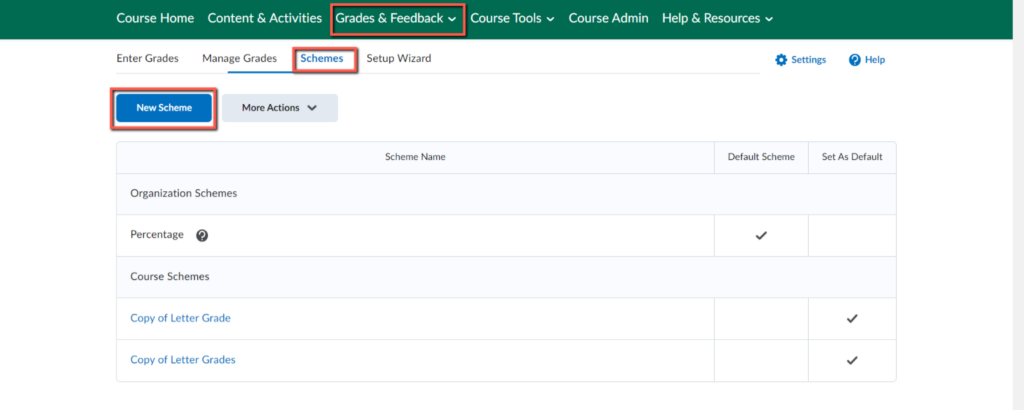 Go to Grades & Feedback > Grades: Schemes >New Scheme