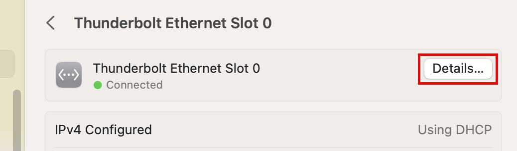 - Select Network from the navigation column on the left, then select your Ethernet Adapter. Mine was called “Thunderbolt Ethernet Slot 0”, but if you have a built-in Ethernet port or a Belkin docking station (for example), yours might say something else. Additionally, yours may not yet say “Connected”.