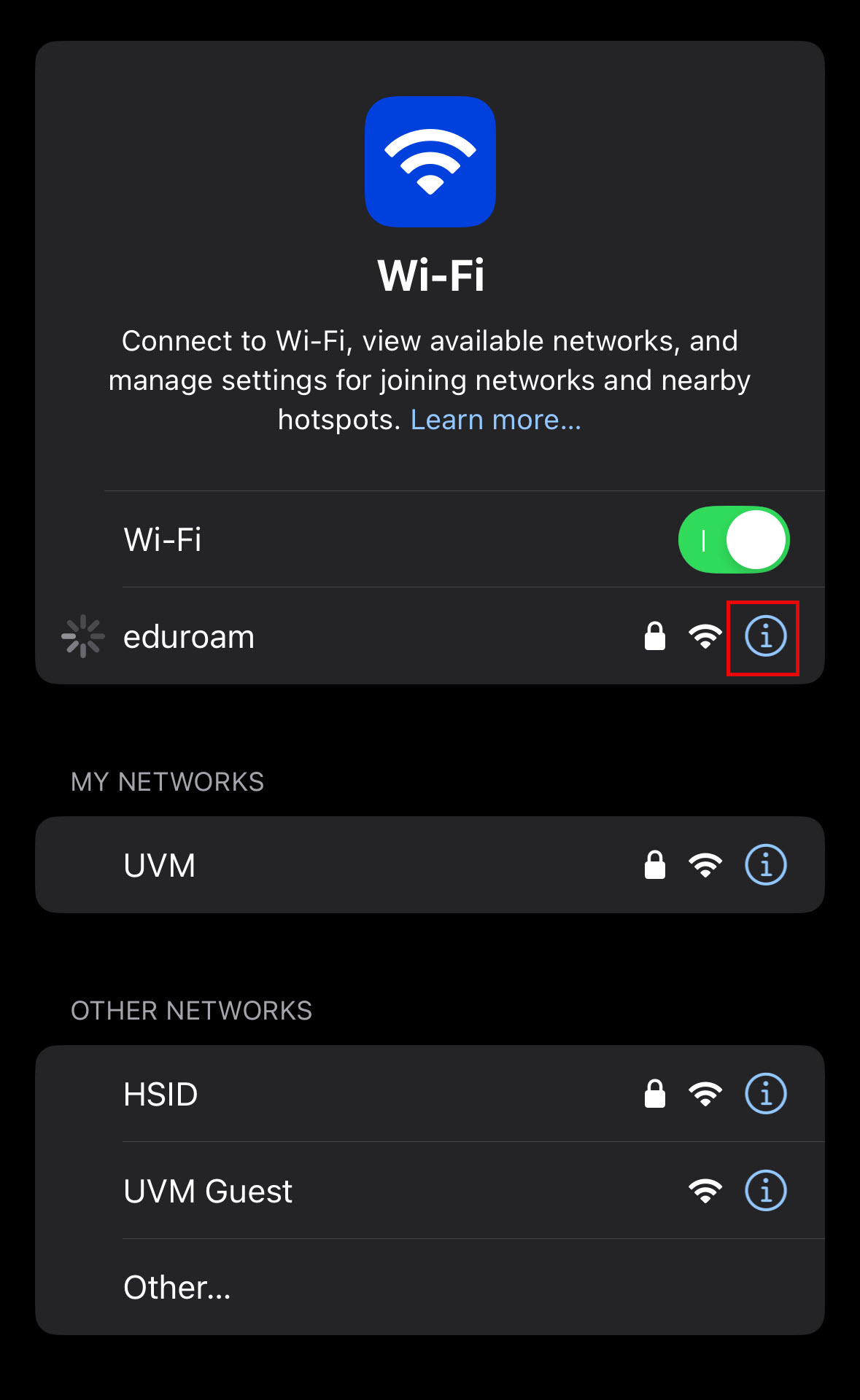 - In the Wi-Fi section, find the eduroam network under Known Networks, then click the circle with three dots in it, and select Forget This Network…