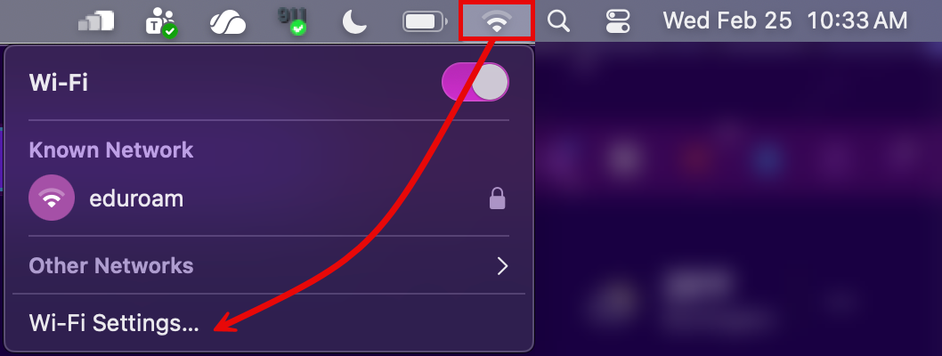 - Click on the Wi-Fi icon in the top right corner, then click Wi-Fi Settings…