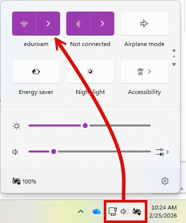 - Open the Quick Settings menu by clicking the network, sound, or battery icon in the bottom-right corner of the screen. Then, click the right caret () to the right of the Wi-Fi antenna (). If airplane mode is enabled, you’ll have to click the plane icon () first to disable it.