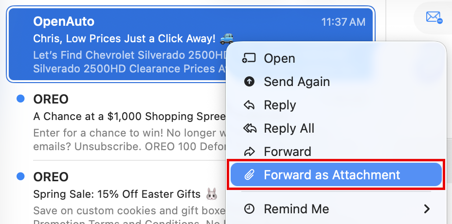 - Select the message you wish to forward as an attachment.