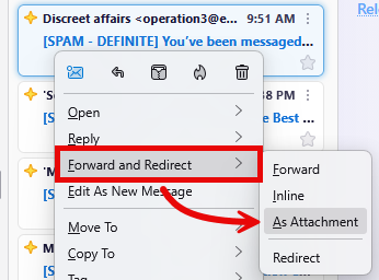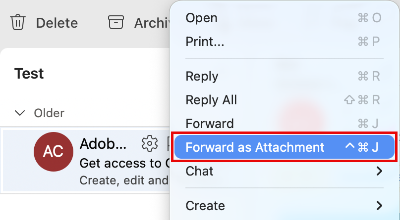 - Open the drop-down menu in the upper-right corner to the right of the sender, hover over Other reply actions, and select Forward as attachment.
