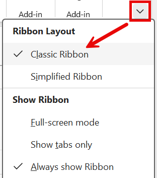 - Ensure the Classic Ribbon is selected by clicking the down arrow () in the upper-right corner and selecting Classic Ribbon.