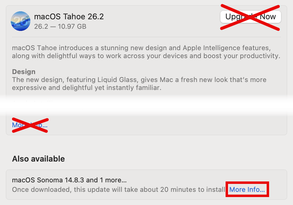 - You’ll be redirected to Software Update, where you may see an upgrade to the newest version of macOS available. Instead of clicking Upgrade Now, click the blue More Info… in the Also available section.