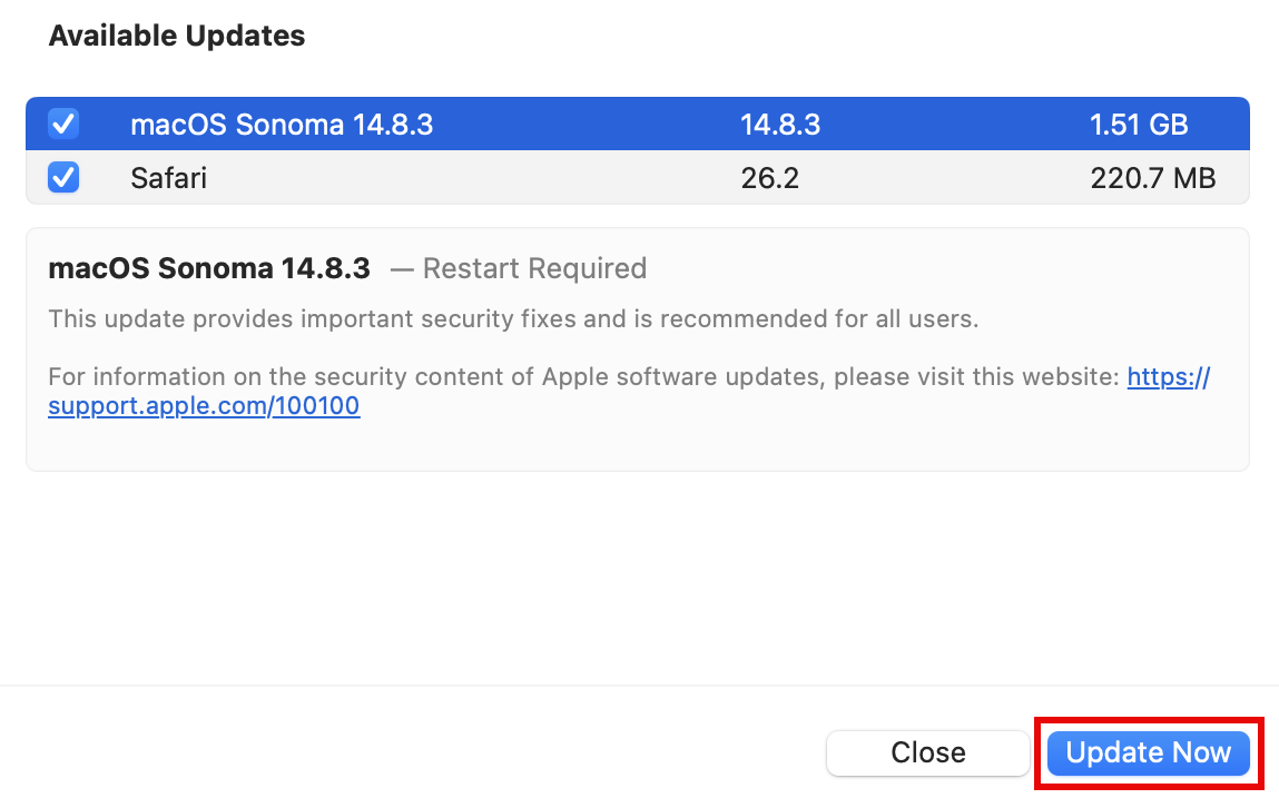 - Make sure all updates are selected, then click Install Now.