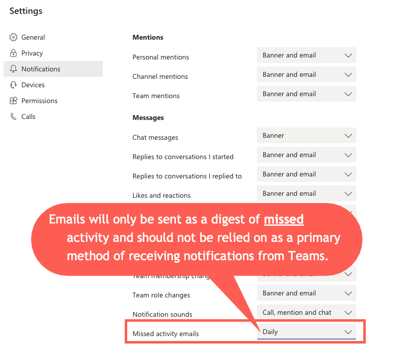 Notifications. - From the drop-down menu, choose the desired frequency for missed activity emails. This is NOT a replacement for being signed into the Teams client and should not be relied on as the primary method of receiving notifications from Teams.