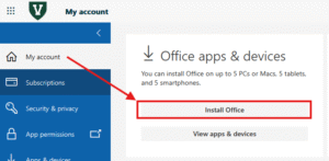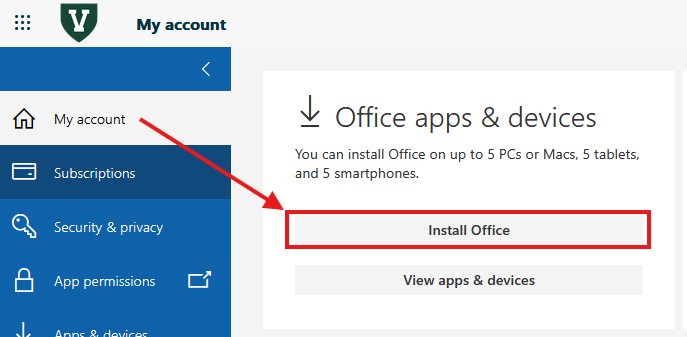- From the Microsoft 365 My account landing page, click the Install Office button located near the upper-left corner of the page under the Office apps & devices heading.