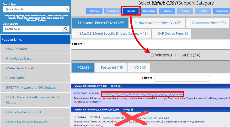 - Click Drivers and expand the Windows_11_64 BIT section. Click the download link for the top option (or at least the top-most option that does not include “_FAX” in the name).