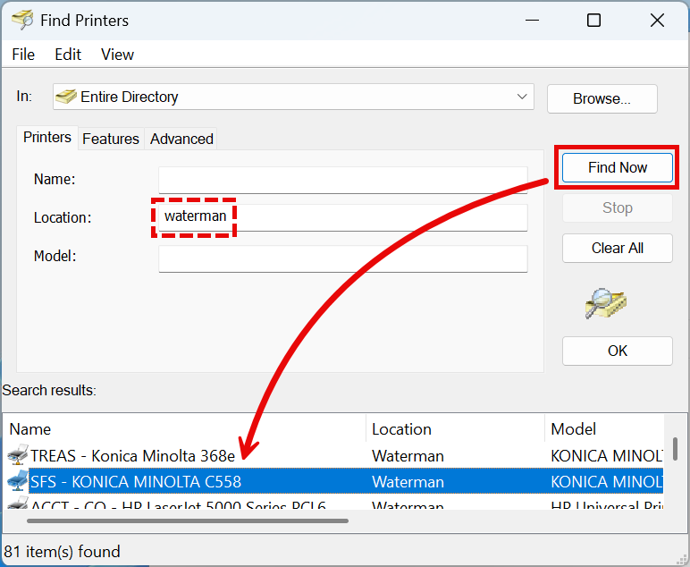- Use any one of the three available search fields to find your printer. I prefer to use the Location field entering the building name, but you can also use the Name field entering the abbreviation for your department name. Hit Enter or click Find Now to show the results. Double-click the printer from the search results that matches the department name and model you were expecting.