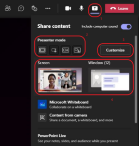 - After your meeting starts, click on “Share Content” in the top right corner of Teams. This will show presenter modes and other content sharing options.