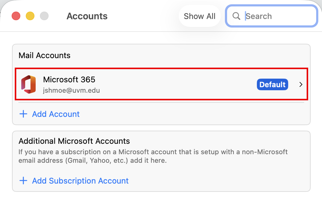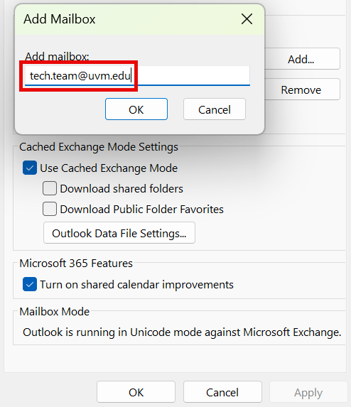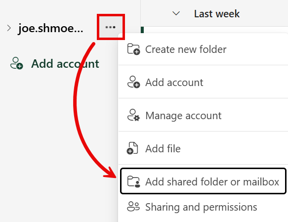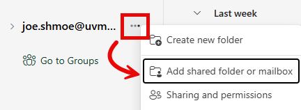 - Hover your mouse over your @uvm.edu mailbox, click the ellipsis menu icon (), and select Add shared folder or mailbox.