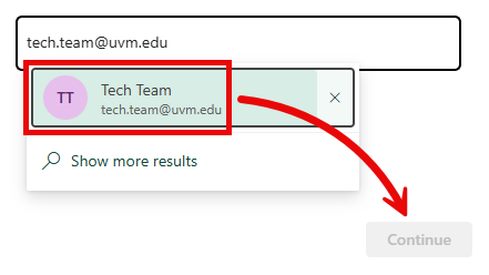 - Type in the email address for the shared mailbox, select it from the results, and then click Continue.