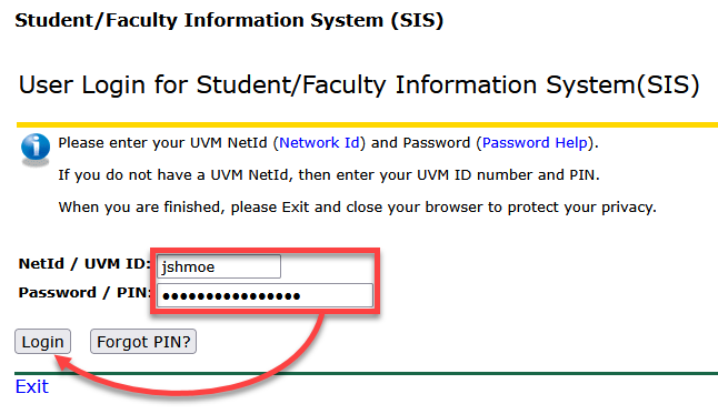 - Navigate to go.uvm.edu/myuvm-proxy and sign into Banner with your NetID and password.