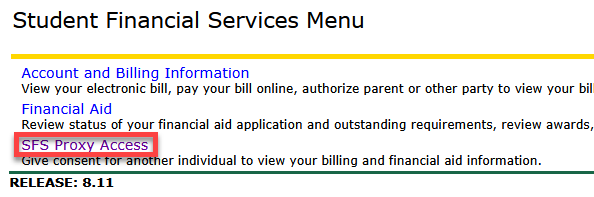 By designating someone as a Proxy, a student is giving Student Financial Services permission to speak with that person about their financial aid and billing account. A student may set up multiple Proxies for their account.