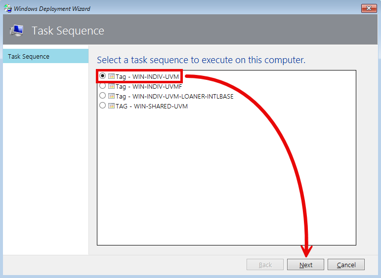- When the Lite Touch environment loads, select the most appropriate deployment option for for your situation (likely “Tag – WIN-INDIV-UVM“), then click Next.