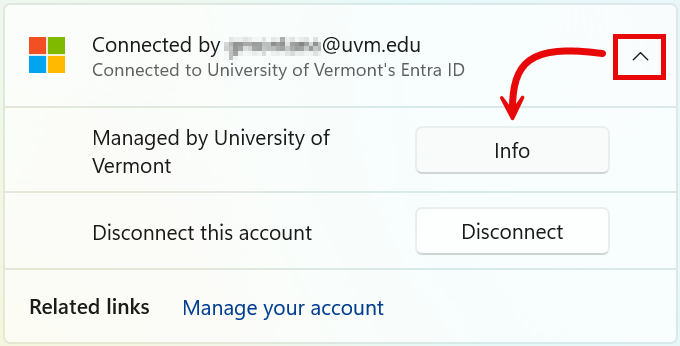 - Expand the account Connected to University of Vermont’s Entra ID, and then click Info.