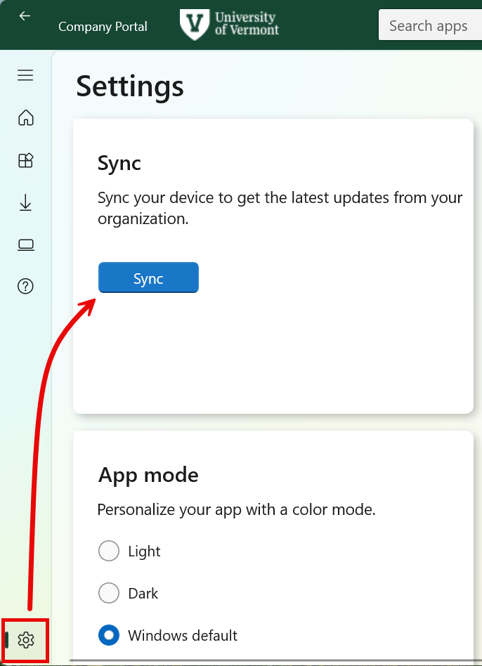 - Once Company Portal loads, click on the Settings tab () in the left hand navigation bar and then click the Sync button.