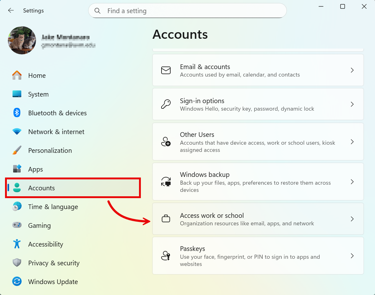 - In Settings click on the Accounts button, scroll down, and select Access work or school.