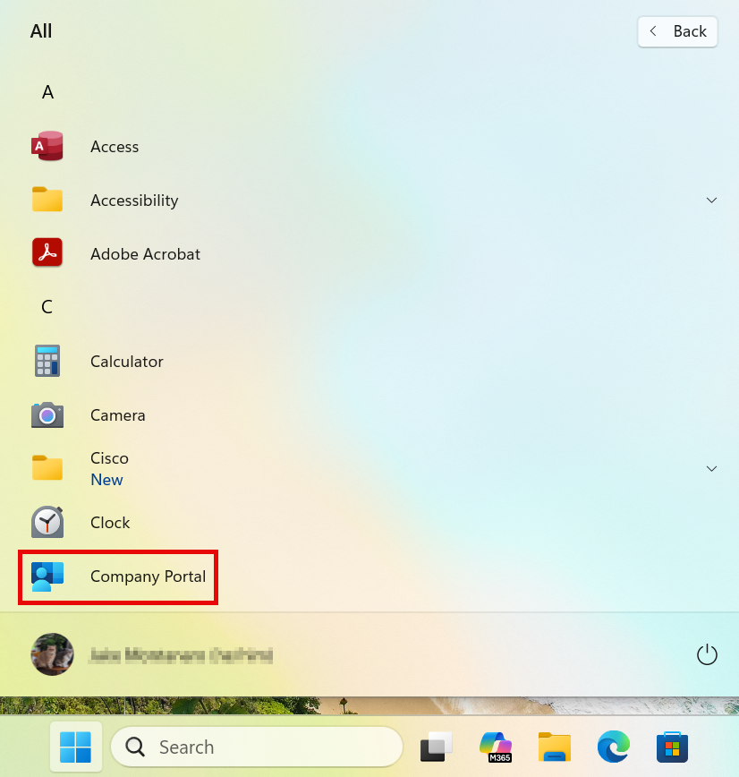 - Click on your Start Menu (or press the key on your keyboard), and then the All button, and then Company Portal.