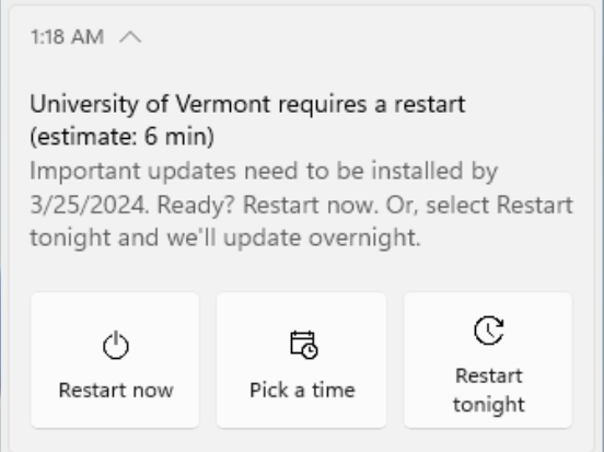 Windows Notification Center will display an alert in the lower right of the display with information about update installation, deadlines, and reboots.