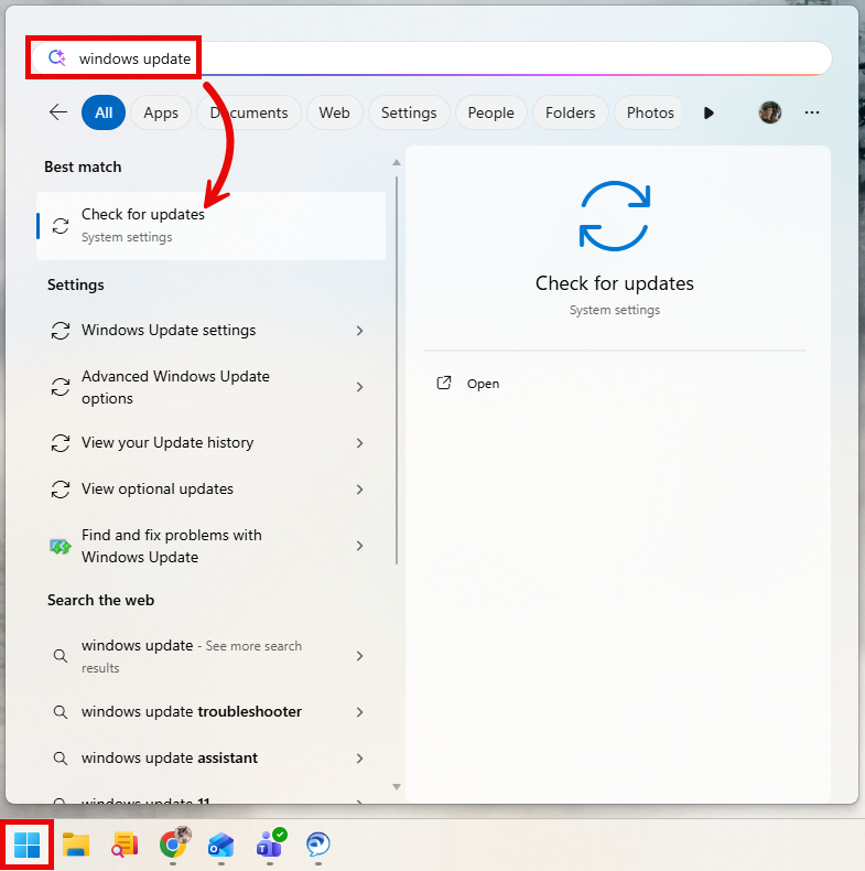 - To manually check for updates, first open the Start Menu () and search for “Windows Update”. In the results, choose the Check for updates result.