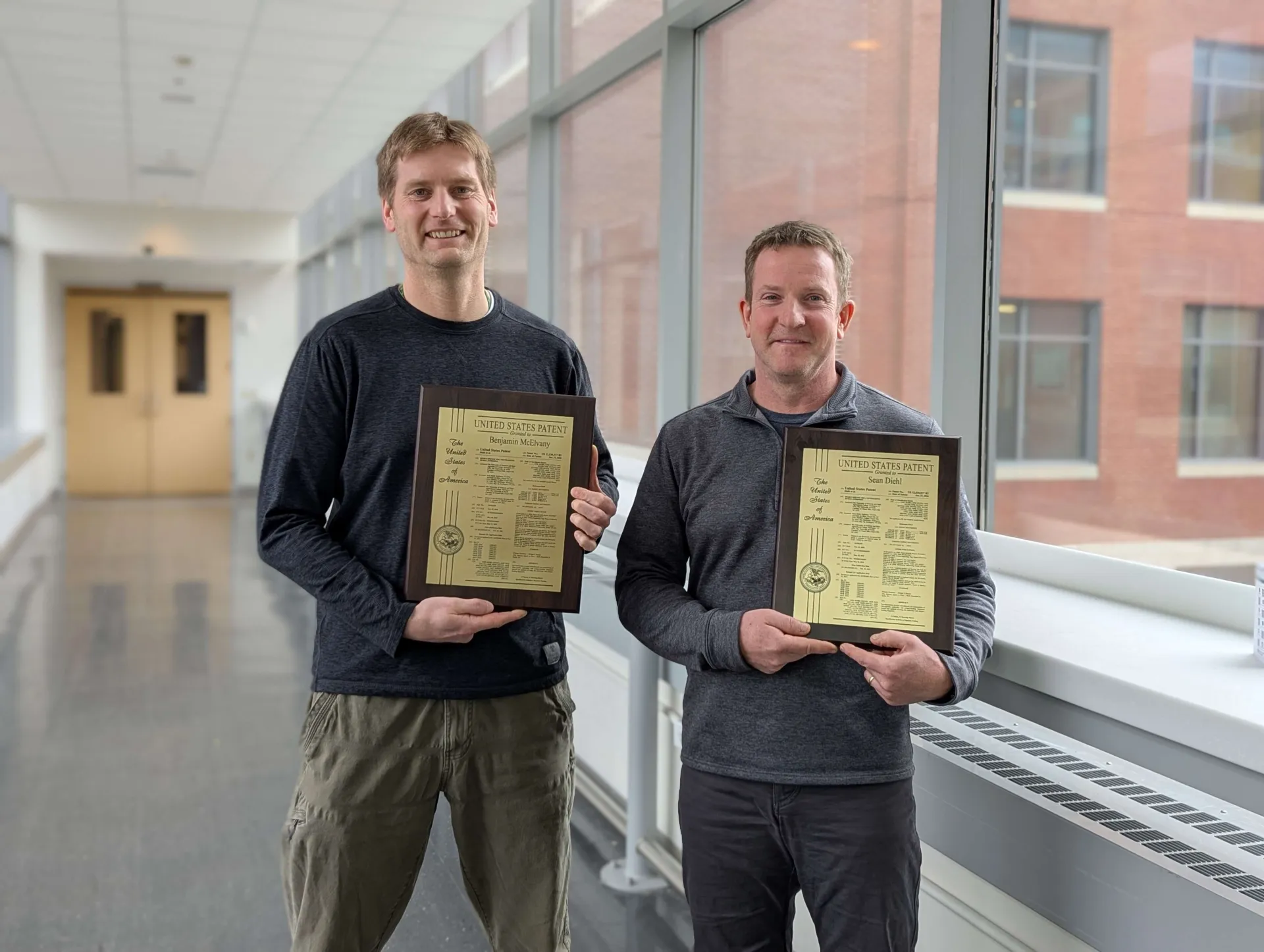 Sean Diehl, PhD Associate Professor of Microbiology and Molecular Genetics, and senior laboratory technician Ben McElvany were honored on Tuesday April 14, 2026 at a UVM research celebration for their U.S. Patent, “Highly Specific Zika Neutralizing Antibodies”. Also on the patent are former CMB PhD graduate student Huy Tu, PhD and collaborators at the University of North Carolina. The team discovered two different human antibodies which specifically block Zika virus. The awarded patent is for the use of these antibodies to prevent or treat disease caused by Zika and will secure these antibodies as proprietary test articles for eventual human trials. Since 1947, Zika has caused several outbreaks, the largest and most recent occurring in Brazil in 2015 -16, where microcephaly in infants born to infected mothers and temporary paralysis in adults was observed. There are currently no vaccines or specific medicines against Zika virus.