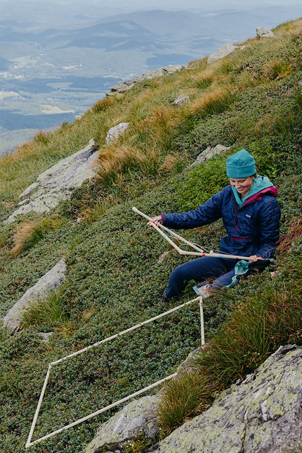 To analyze alpine plants on Mansfield’s summit, Wessel uses a simple square meter made from PVC piping. She places the square on a randomized spot, called a quadrat, and places another, smaller square inside.