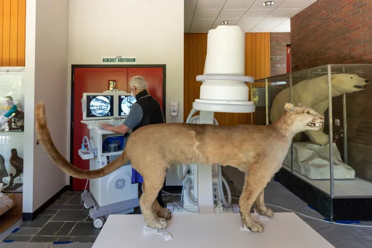 A few days later, Goldberg and the two students climb into one of the glass cabinets, pick up the collection’s semi-famous, slightly bedraggled and distinctly crazy-looking mountain lion. With gloves and great care, they ease the specimen under the beam of a portable x-ray machine, operated by UVM cardiology research technician Steve Bell. “I happen to love taxidermy too,” he says.