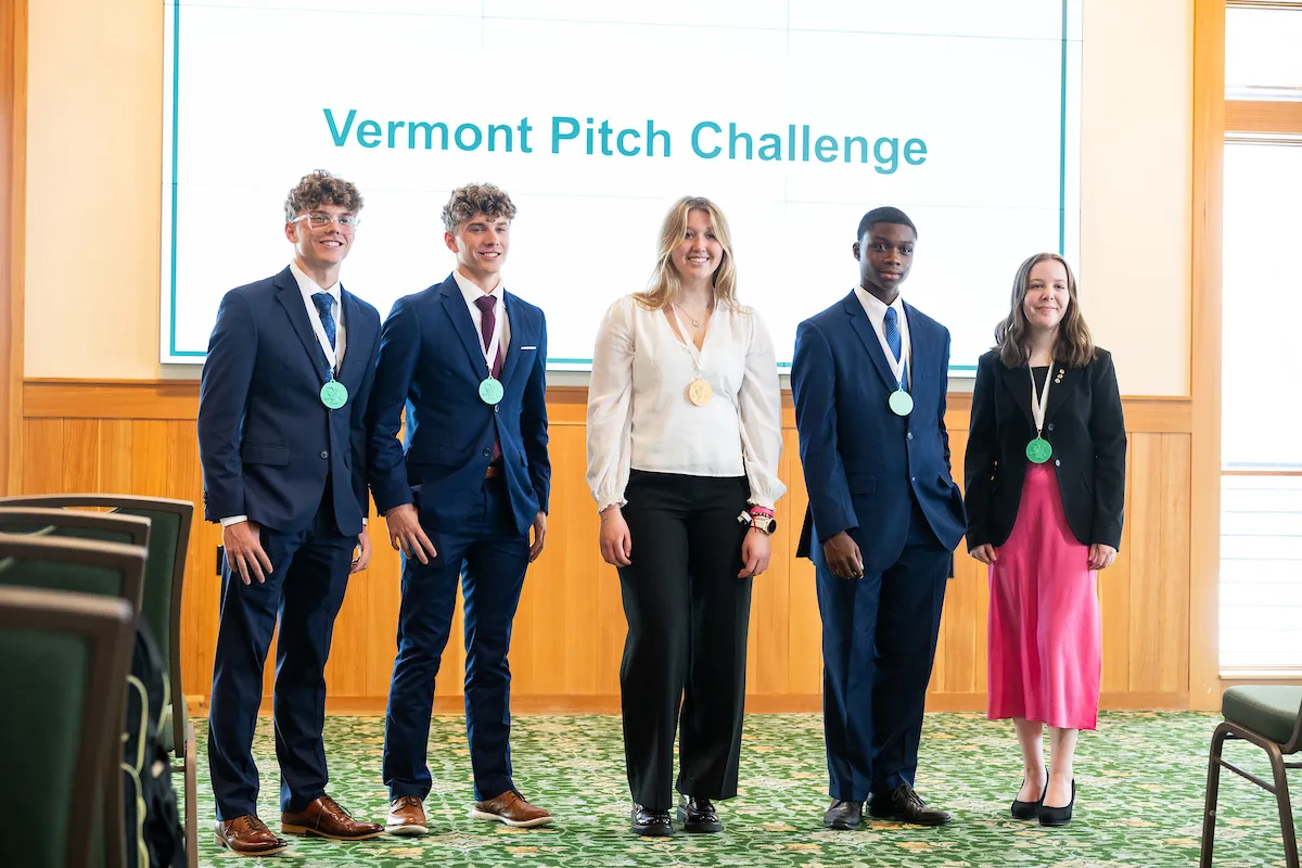 The finalist teams of the Vermont Pitch Challenge. Pictured left to right: Parker Jones, Pierson Jones, Pippa Scott, Danny Philip, Eliza Strum (not pictured: Sebastian Tan)