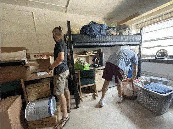 Mason Hall | August 26 | Roommates Sam Will and Jonas Campagna leave their door open to cool the room down with a cross breeze; they also keep it open to make new friends. Sam (right), a computer science major, takes out a tattered pair of skateboarding shoes that "are kind of destroyed now," having lived in them for the past four years. He shows Jonas (left), an environmental sciences student, the bright new pair he just bought to replace the relics and likely spend the next four years in. "I don't have any skating shoes," Jonas says, "but I did bring some stuff in a 'Live Crickets' box because I thought it would be funny. I have it sitting here — there are no crickets in there."