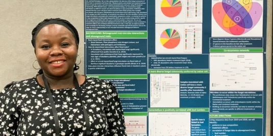 Sandra Nnadi is a Ph.D. student in Plant Biology department. Sandra’s research evaluates the effects of mycorrhizal fungi inoculation on the fungal microbiome of blueberry roots and how the interactions between the roots and the microbiome influence floral traits like flower number, bud count and berry traits like anthocyanin content and berry mass. Her research can help farmers determine if it is cost effective for them to invest their money into these natural, commercial inoculants. Sandra is presently analyzing the data. Her advisor is Jeanne Harris in the Department of Plant Biology.