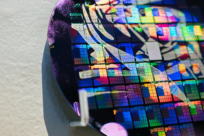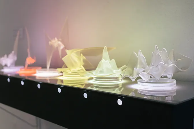“Each one of these sculptures is based on one of the images. I took an image and turned it into a line drawing,” Karson said. “It's just based on the contours, and I took those contours into a 3D modelling program and created a topography within them. I made decisions about what would be high or low. It was related to the idea of exploring a multidimensional space. You're seeing them in 2D here, in transition [on the silicon wafers], and now you're seeing in a 3D topography.”