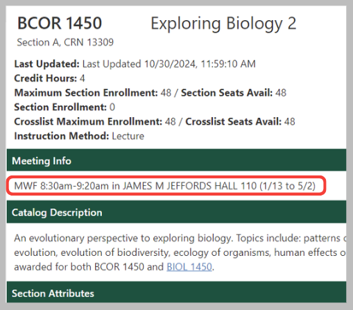 - The currently open Course Information menu will refresh with chosen Section Information. Course section room assignment will be located under the Meeting Info section.