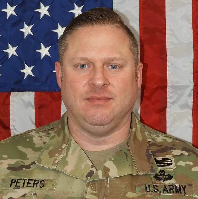 MSG Peters’ military education includes Sapper Leader Course, Jumpmaster School, Master Leaders Course, Senior Leader Course, Advanced Leaders Course, Basic Leader Course, Master Counter IED Course, OC/T School, Engineer-Explosive Ordnance Clearance Agent Course; Drill Sergeant School, Army Basic Instructor Course, Combatives level 1 Course, Route Reconnaissance and Clearance Leader Course, Urban Mobility Breaching Course, and Airborne School. He holds an Associates degree in Criminal Justice and an Associates degree in Culinary Arts.