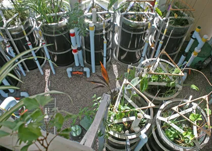 The Eco-Machine is designed as a research tool. What you see in the Eco-Machine room is not one but three nearly identical treatment systems, or “treatment trains,” each made up of three large tanks, running parallel to each other. On top of this, each train is plumbed in such a way that the sequence of treatment cells can be changed. So, there is an experiment, and research questions, built into the system already: how do the different treatment sequences compare to each other in terms of water quality, air requirements, or ease of maintenance?