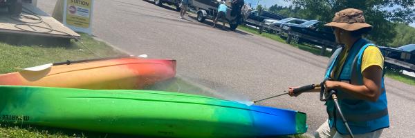 To address small bodied organisms like young zebra mussels that cannot be seen with the naked eye, decontamination stations have been included into the boat launch steward program. Decontamination stations have been added to the highest risk locations because preventing organisms from entering water bodies is much cheaper than managing them once they’re established. The burden of managing invasive species once established requires the consistent hunt for funding with limited resources.