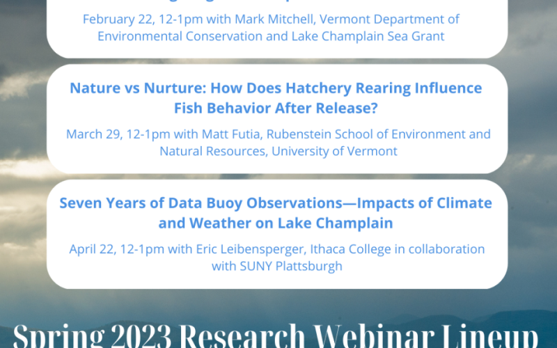 Lake Champlain Sea Grant is pleased to host monthly research webinars on topics that are critical to the environment and economies of the Lake Champlain basin and important in watersheds around the world. Click on any of the spring 2023 webinars listed below for more information and to register.
