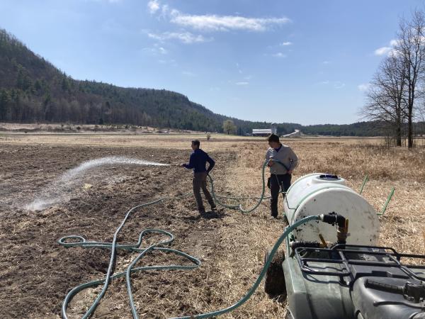 Image: At the Hubbardton River Clay Plain Forest in Benson VT is a test site for the direct seeding project. Two TNC crew members are using the hydroseeder to spread seed on the site. The picture was taken in April of 2021.