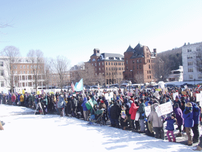 Hundreds of Anti-war protesters stand in front of State House in Montpelier.