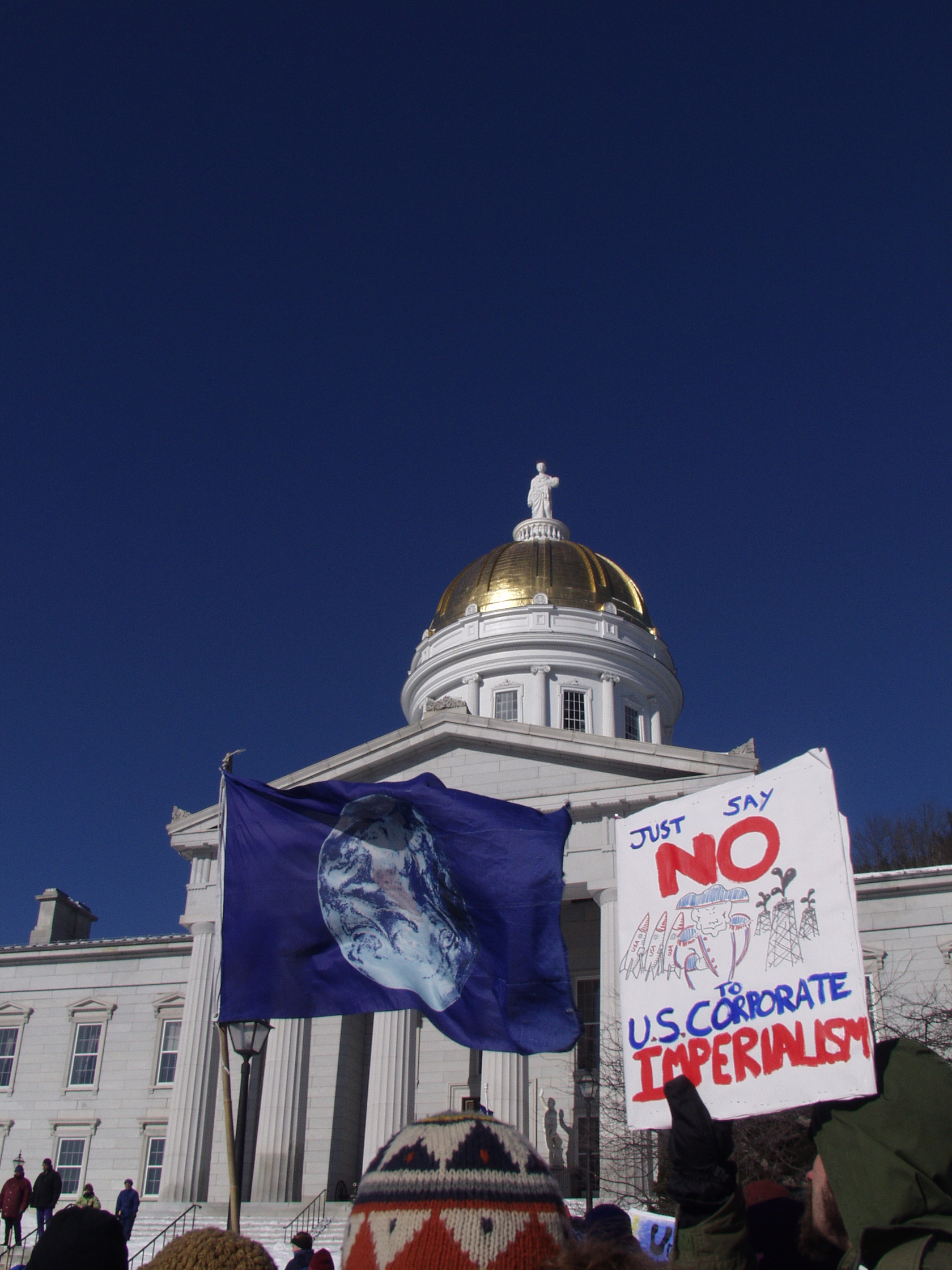 Placard saying "Just say NO to U.S. Corporate Imperialism" and Earth flag waving in front of State Capitol building.