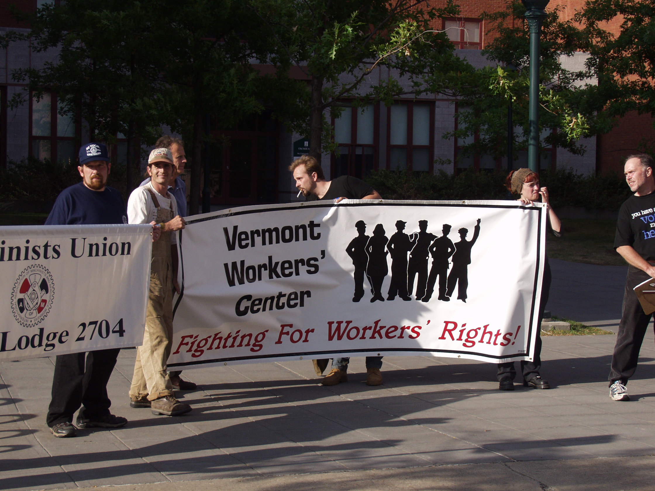 Labor holding up banners.