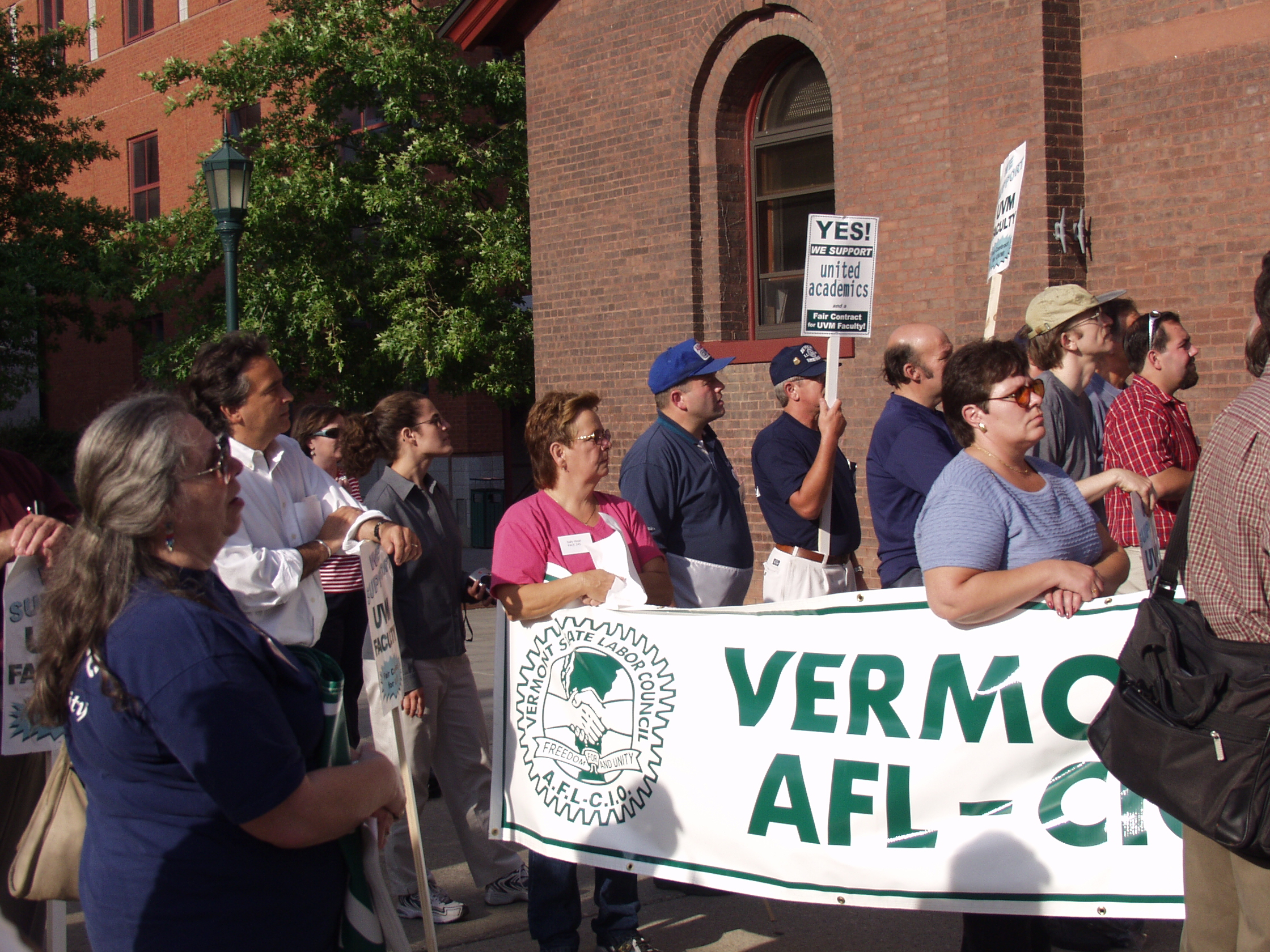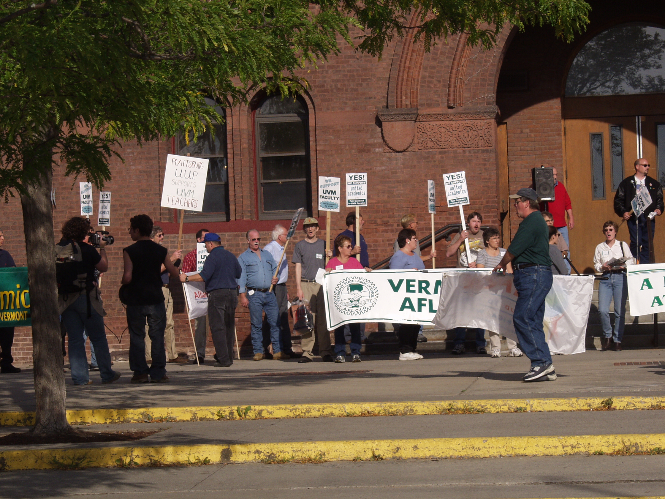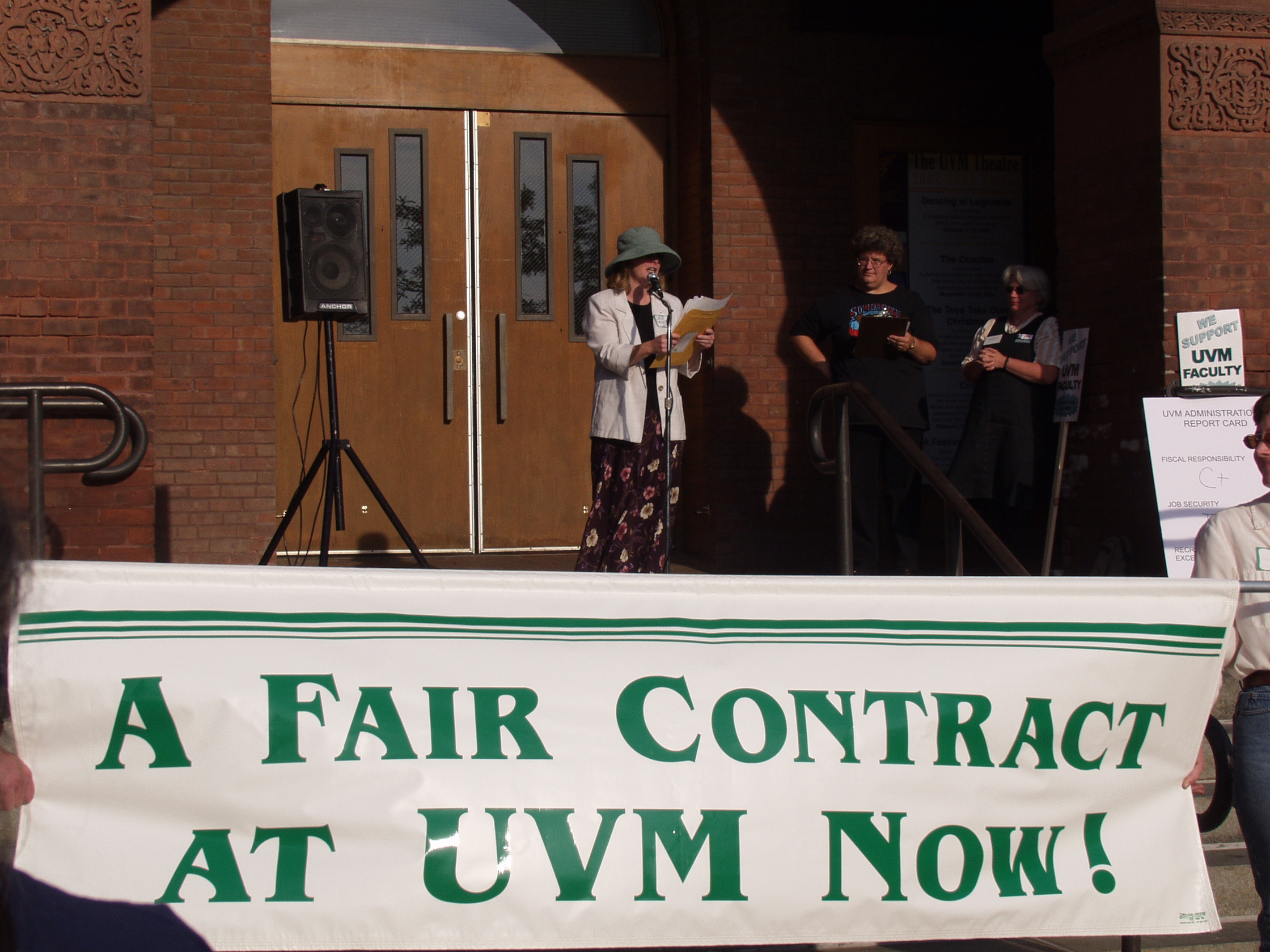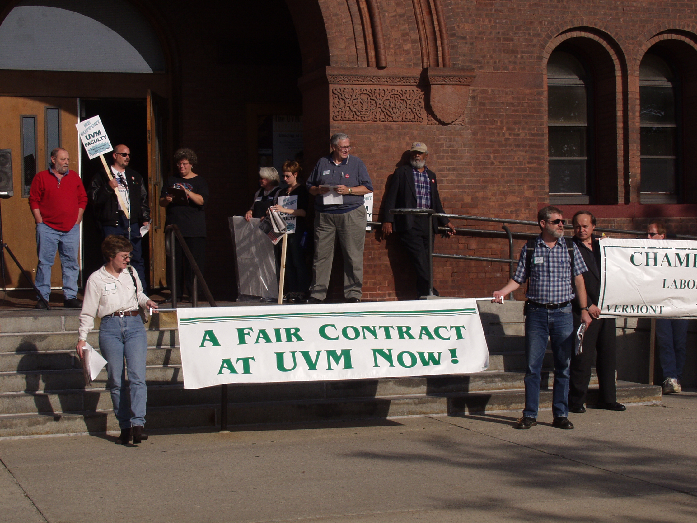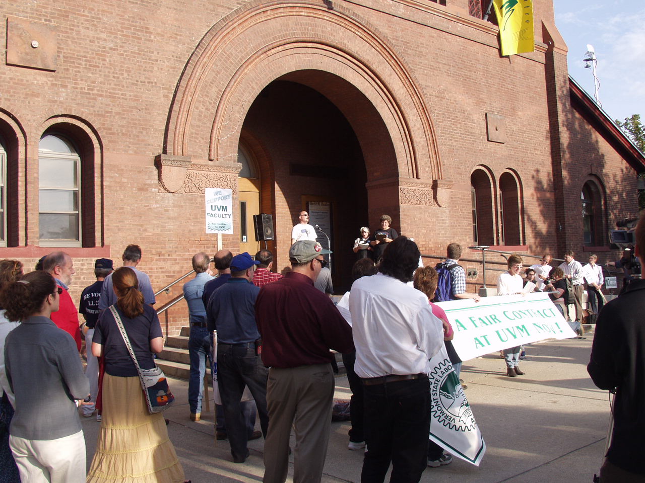 The following photographs were taken on Friday, September 13, 2002, at the United Academics (UA) - AFT/AAUP Rally for a Fair Contract. The rally was held in front of the Royall-Tyler Theatre on the University of Vermont Campus, Burlington, Vermont. The rally followed a march from the Holiday Inn on Williston Road. Photographs are of the crowd and speakers which include members of organized labor, faculty, staff and students.