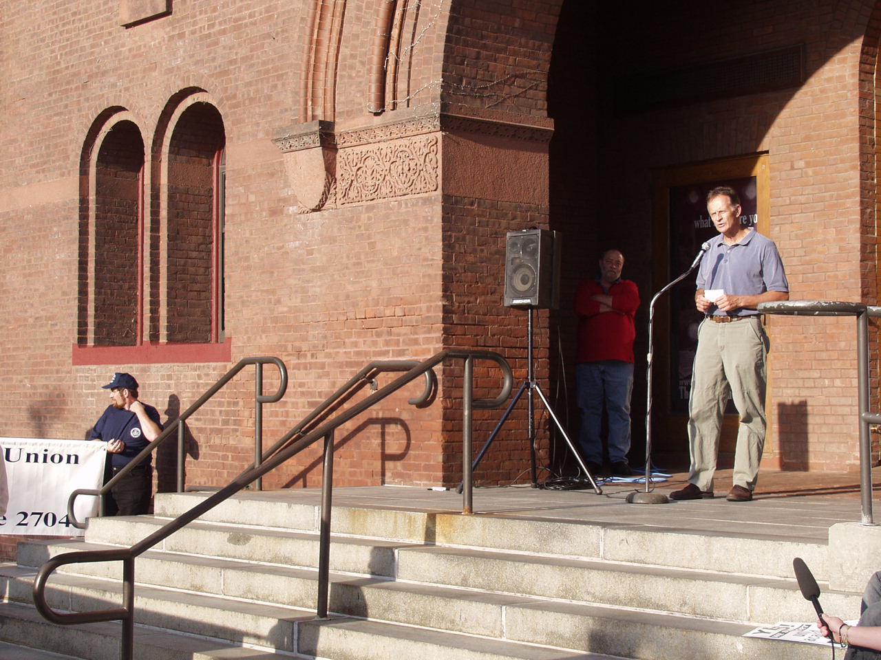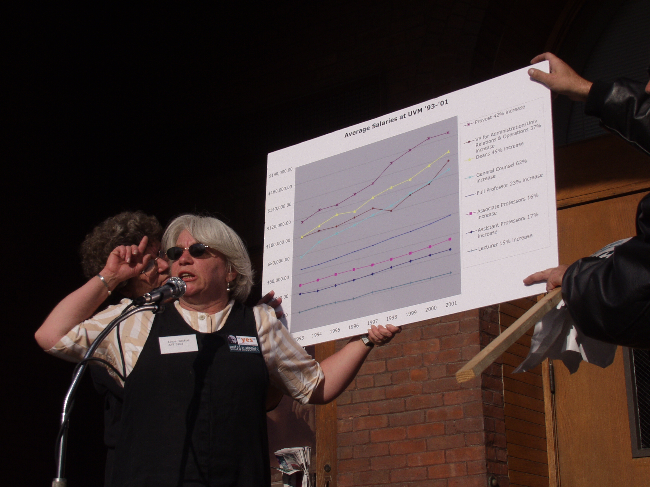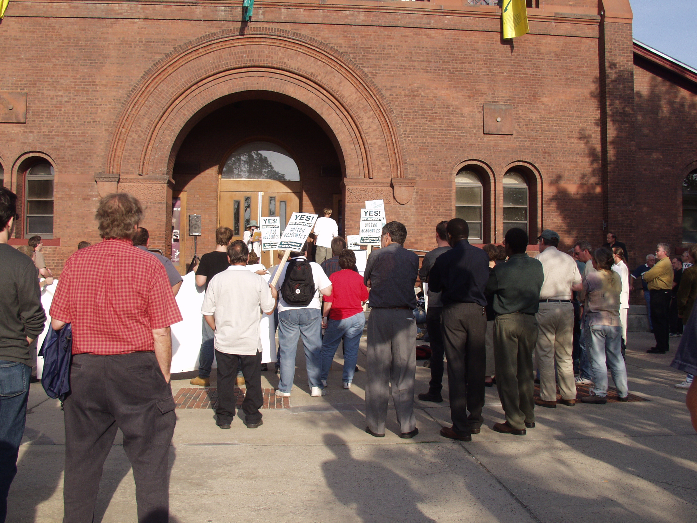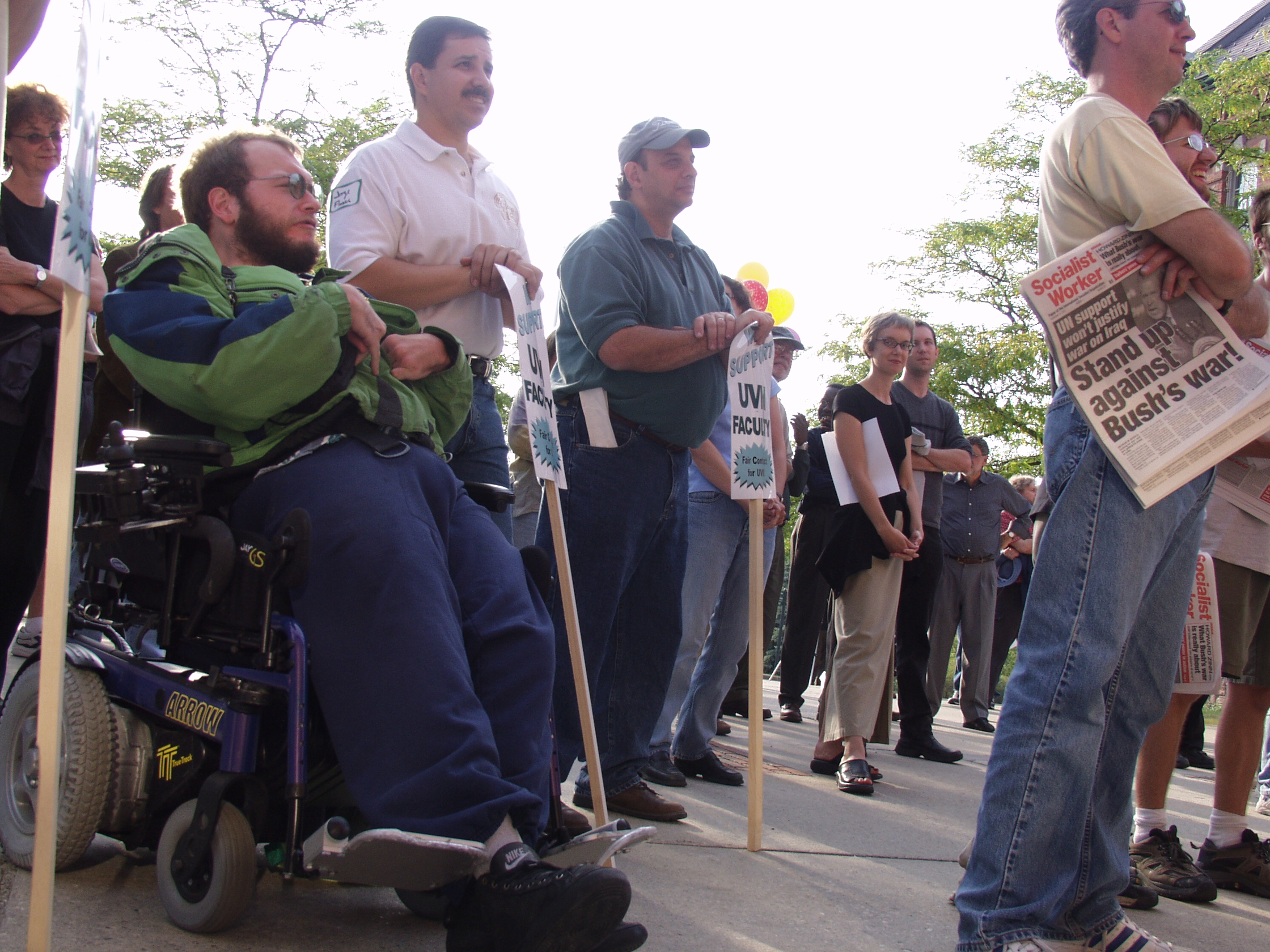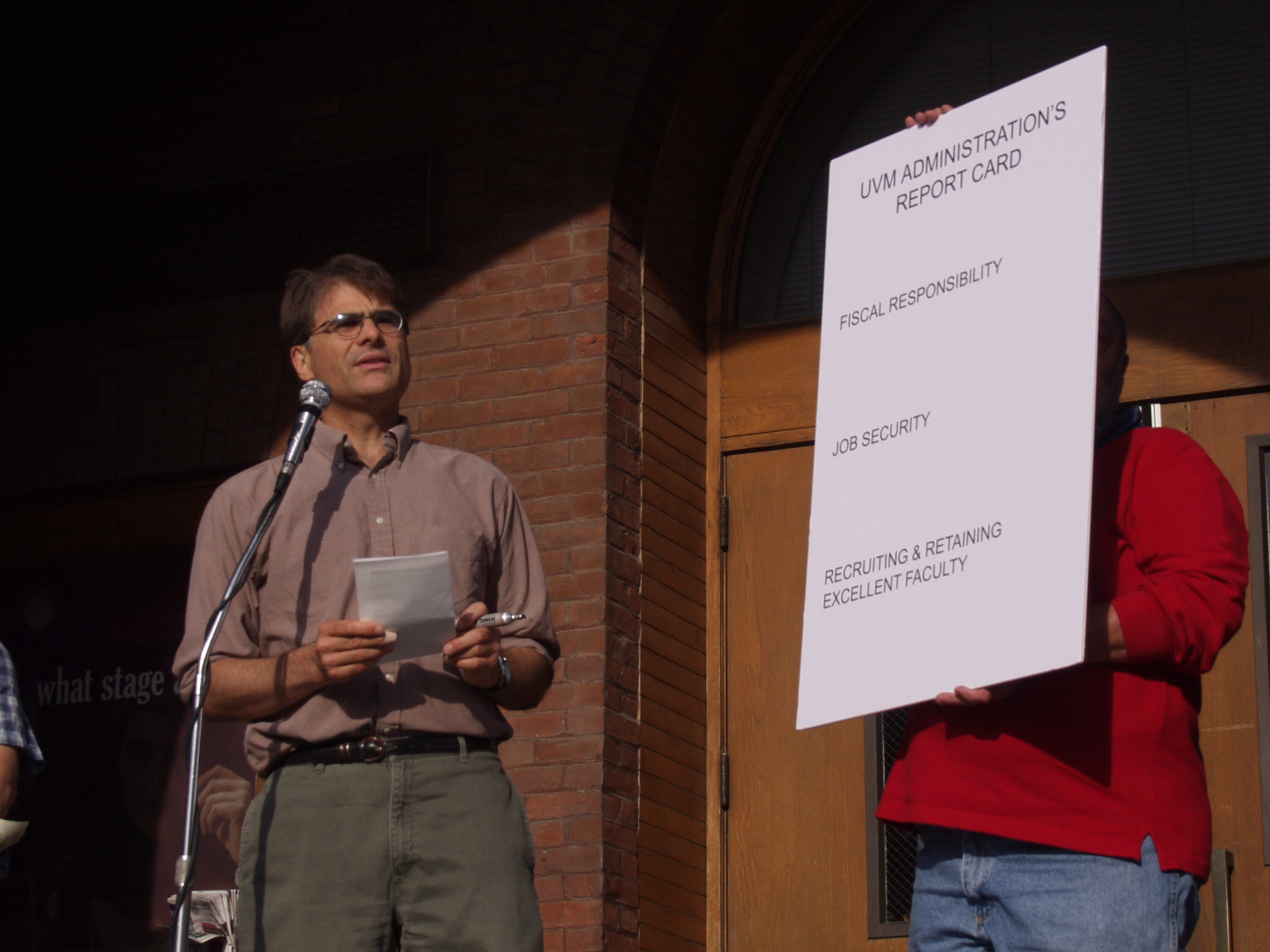 The following photographs were taken on Friday, September 13, 2002, at the United Academics (UA) - AFT/AAUP Rally for a Fair Contract. The rally was held in front of the Royall-Tyler Theatre on the University of Vermont Campus, Burlington, Vermont. The rally followed a march from the Holiday Inn on Williston Road. Photographs are of the crowd and speakers which include members of organized labor, faculty, staff and students.