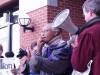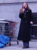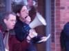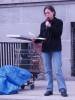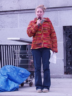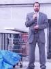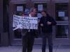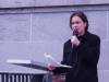 Pax Christi member calls for the ending of racist policies and sings for peace and justice in front of Senator James Jeffords Burlington office.