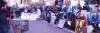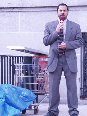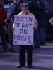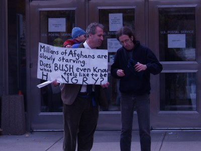 A man with his baby on his back stand in front of Federal Building. His sign reads: "Millions of Afghans are slowly starving. Does Bush even know what it means to be hungry?"