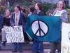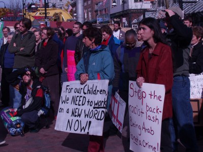 Marchers listen in front of Burlington City Hall. One sign reads: "For our children, we need to work on a new world now!" Another sign reads "Stop the racist backlash. Being Arab is not a crime."