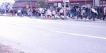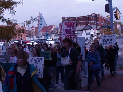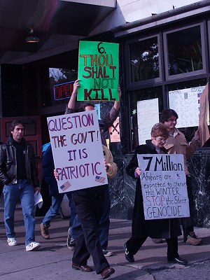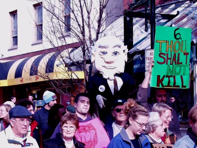 March begins down church and east on Main Street, George Bush puppet seen with sixth commandment: though shall not kill.