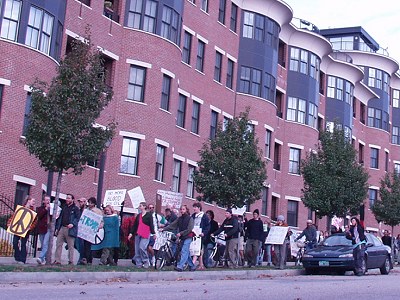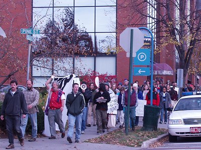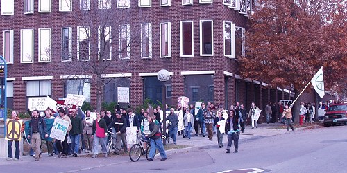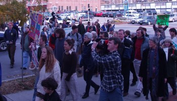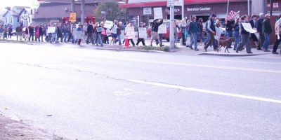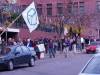 Shot of the back half of the group of marchers as they head up North Winooski.